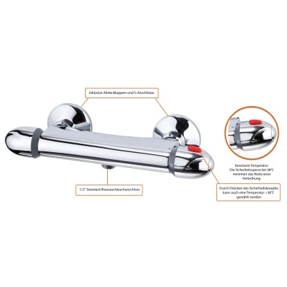 Eisl Vital Thermostat Duscharmatur Chrom. Der genormte 1/2 “ Brauseabgang ermöglicht den Anschluss vieler handelsĂĽblicher Duschschläuche. Die Thermostatarmatur ist werkseitig mit einer Temperatursperre bei 38° ausgestattet und minimiert damit das Risiko vor VerbrĂĽhungen – mehr Sicherheit fĂĽr die ganze Familie. FĂĽr eine höhere Wassertemperatur kann die Sperre deaktiviert werden.