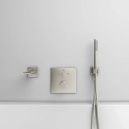Idealrain ist ein vollständiges Brauseprogramm mit allen Komponenten zur Ausstattung eines schönen und komfortablen Duschbereichs. Dazu zählen zum Beispiel Handbrausen mit Navigo-Umschaltung und formschöne Kopfbrausen.
