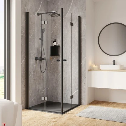 Die Schulte ExpressPlus Drehfalttür Eckeinstieg Garant 2.0 Mattschwarz hat eine Größe von 200 cm x 100 cm x 100 cm und setzt sich aus insgesamt vier 6 mm starken Sicherheitsglas-Elementen (ESG) zusammen. Die beiden Türelemente öffnen über zwei formschöne Griffe über Eck und bieten somit einen großzügigen Einstiegsbereich. Die raumsparende Tür lässt sich einfach zusammenfalten, sodass auch im geöffneten Zustand kein Element in den Raum hineinragt. Dies macht die Drehfalttür zur optimalen Lösung für kleine Bäder. Die eleganten Profile und Anbauteile setzen die Duschtüre zudem optimal in Szene und halten sie sicher in Position.