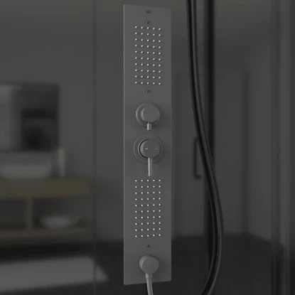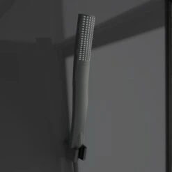 – Die silbergraue Duschwanne rundet den eleganten Look der Komplettduschkabine ab.