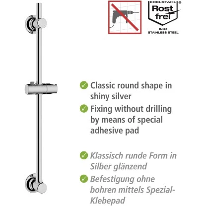 Die Duschstange wird mittels Spezial-Klebepads an den Wandhaltern befestigt. Besonders praktisch: Einer der Wandhalter ist individuell verschiebbar, sodass unter Umständen bestehende Bohrlöcher verdeckt werden können. Die Stange ist auch nach vielen Jahren der Nutzung rückstandslos entfernbar. Alternativ kann die Duschstange auch konventionell mit den beiliegenden Schrauben und Dübeln an der Wand montiert werden. Gehalten in klassischem Chrom fügt sich die Duschstange ohne Bohren problemlos in die meisten Bad-Einrichtungen ein. Viele Bad-Armaturen weisen ebenfalls das glänzende Silber auf, sodass sich ein harmonisches Gesamtbild in Ihrem Badezimmer ergibt.
