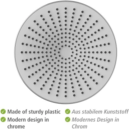 Hergestellt ist der Regenduschkopf aus stabilem Kunststoff (ABS). Durch die Noppen an der Brause lässt er sich leicht reinigen. Etwaige Kalkablagerungen an den Düsen können einfach mit dem Finger abgerieben werden. Der langlebige Duschkopf verfügt über einen 1/2 Universalanschluss und ist auch für Duschen mit Durchlauferhitzer geeignet. Der Regenduschkopf Ultimate Shower von Wenko in Chrom beschert Ihnen ein ultimatives Duscherlebnis. Das Design in der Verbindung aus Chrom und Weiß macht die Duschkabine zudem zu einem modernen wie klassischen Wohlfühlort. Passend zur Regendusche ist eine Handbrause erhältlich, die per Knopfdruck drei unterschiedliche Funktionen bereithält.